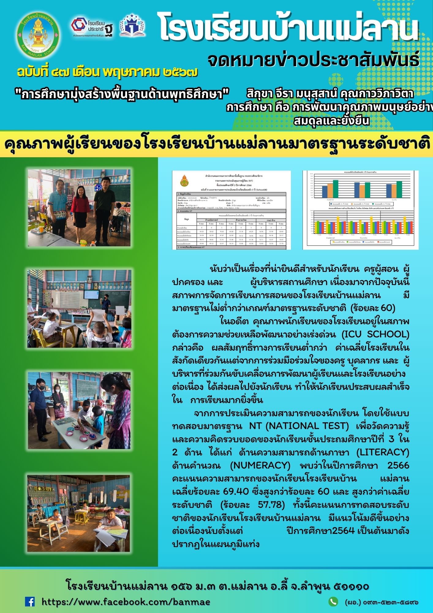 คุณภาพผู้เรียนของโรงเรียนบ้านแม่ลานมาตรฐานระดับชาติ NT